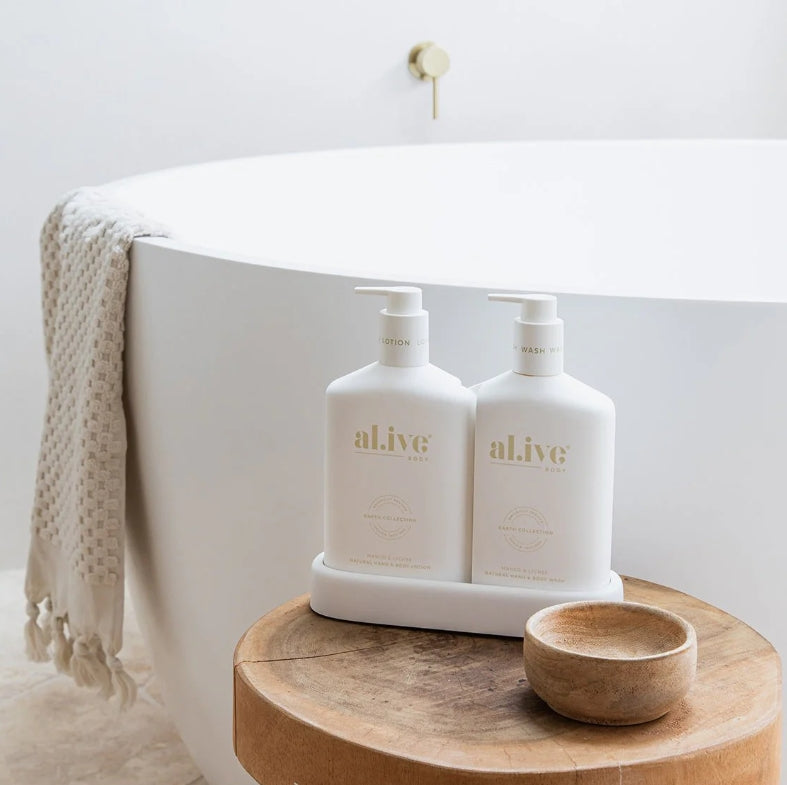 The al.ive body Wash & Lotion Duo in Mango & Lychee contains a luxurious blend of naturally derived ingredients, fortified with essential oils and native botanical extracts.