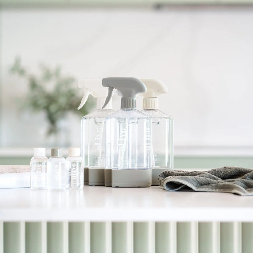 This kit includes everything you need to get started on your cleaning journey: three refillable bottles, each pairing with a 50ml cleaning concentrate for All Purpose, Bathroom, and Glass & Mirror cleaning, as well as three companion microfibre cloths and three bottle stations with connectors that allow you to customise your cleaning station to suit your needs.