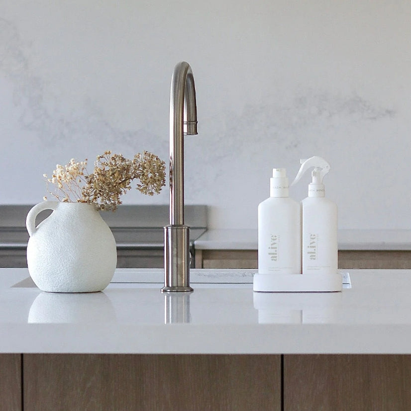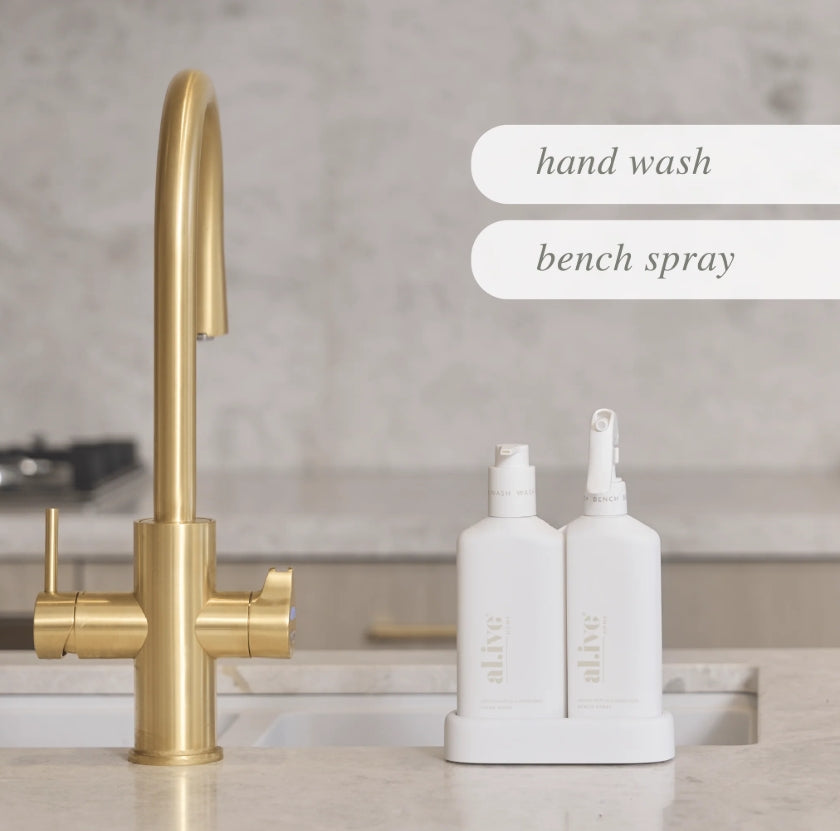 Enhance your kitchen routine with our Lemon Myrtle & Honeydew Kitchen Duo in Crisp White. This set includes our Bench Spray and Hand Wash, conveniently nestled within a beautifully designed custom tray to elevate your kitchen countertop.