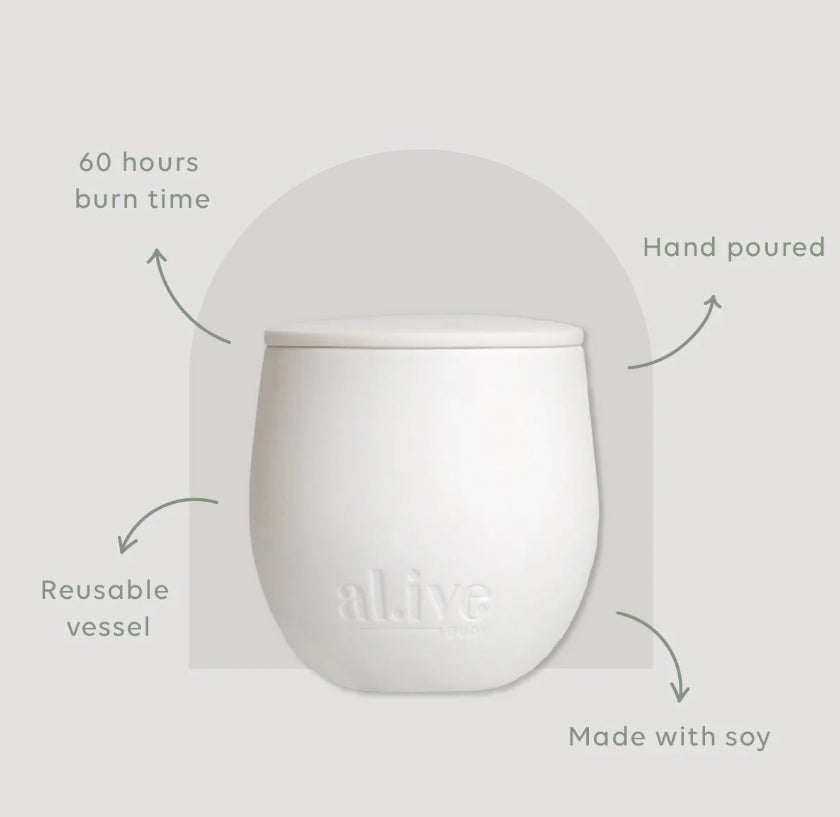 Each al.ive body Soy Candle is housed in a tactile ceramic vessel, a beautiful objet d’art that has value and function long beyond the lifespan of the candle wax. Once cleansed of wax and wick residue, the vessel can live on as a styling item or coffee cup (thanks to being microwave and dishwasher safe).