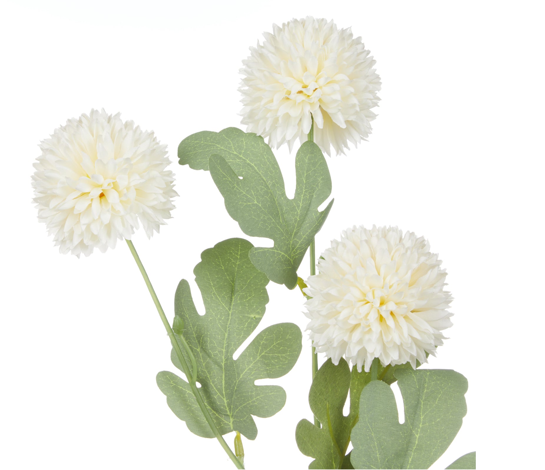 With remarkable attention to detail, it displays a beautiful white kiku blossom and vibrant green leaves on a sturdy green stem.